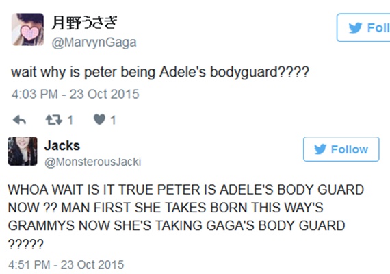 Но докато феновете на Адел въздишат по готиния ѝ охранител, феновете на Лейди Гага се възмутиха, че красавецът вече не е „нейн“.