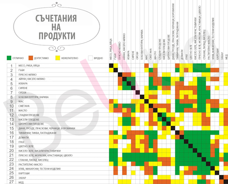 Тази таблица ще ви помогне да разберете най-точно и лесно съвместимостта на отделните продукти и да изготвяте без проблеми здравословно меню за вас и семейството си.