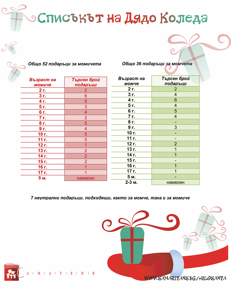Сдружение "Самаряни" е организация, с подкрепата на UNICEF, чиято мисия е да работи за пълноценното приобщаване към обществото на деца, младежи, възрастни и семейства в неравнопоставено положение. Тази Коледа сдружението организира кампания, под наслов „Помогни на Дядо Коледа“. Целта е да се съберат подаръци за дечица, настанени в приемни семейства; деца, пострадали от насилие; деца, в риск от изоставяне. Нека подарим една усмивка!