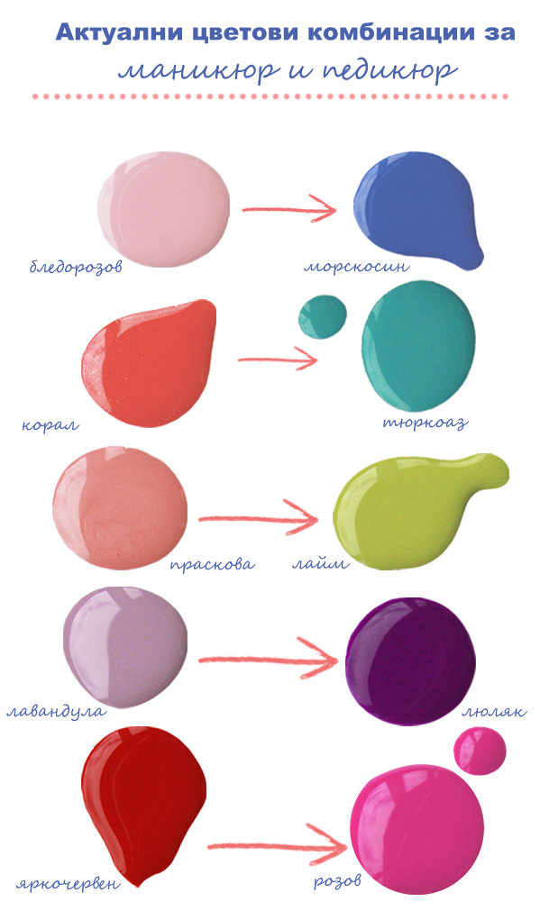 Дами, не се колебайте да направите смела цветова комбинация, защото така ще се радвате на по-стилна и дръзка визия. Ако харесвате наситените и ярките цветове ви съветваме, да купувате по-качествени лакове за нокти, защото плътността ще по-добра, а и ще сте сигурни, че цветът ще изглежда по същия начин, когато се нанесе.