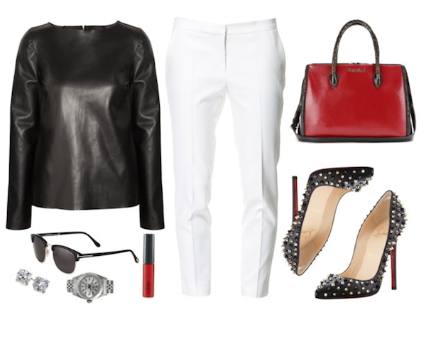 Бял панталон тесен панталон и кожена блуза. Придайте допълнителна драматичност, като добавите обувки с шипове и червено червило.